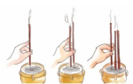 在中国道教文化中,上香是一种重要的宗教仪式,不仅是对神灵的敬仰,也是修行者表达虔诚与祈愿的方式。道教上三炷香,代表供奉道教所尊的玉清、上清、太清境以及居佳于此的玉清元始天尊、上清灵宝天尊、太清道德天尊三位尊神。道教上香礼仪选择三支(或一支)长短相同的香,避免使用化学香。左手持香,脚将香头朝下点燃。可以默念上香咒:“常焚心香,得大清静。”若香燃起明火,切忌用嘴吹灭,可用右手稍微扇一下或晃一下熄灭明火。拓香时左手在外,右手在内,左手包右手,象征以善包恶。烧香忌回顾,心神专注,双手平举至胸口,称为“心