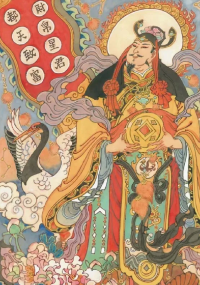 文财神李诡祖又称财帛星君、增福相公、增福财神,李诡祖作为中国民间最具亲和力的财神之一,多与 “福、禄、寿” 三星并列,形成 “五福临门” 的吉祥组合。明清至民国时期,李诡祖是木版年画中最常见的财神形象,他的绘像经常与“福”“禄”“寿”三星和喜神列在一起,合起来为福、禄、寿、财、喜。增福财神画像文雅非凡,锦衣玉带,头戴朝冠,身穿红袍,白脸长须,面带笑容,左手执如意,右手执聚宝盆。身后二童子为他打着日月障扇。左青龙,右白虎,口吐孔钱和元宝,显得这位财神爷神通广大,有取之不尽用之不竭,源源而来的金银财宝。