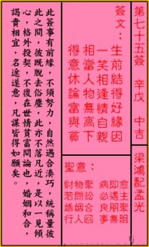 关帝灵签第七十五签,梁鸿配孟光,关帝灵签第75签解签