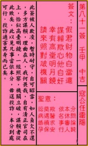 关帝灵签第八十一签,寇公任雷阳,关帝灵签第81签解签