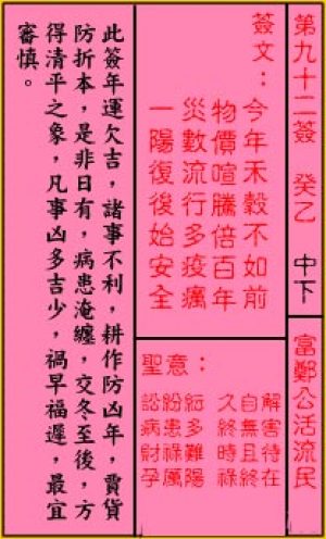 关帝灵签第九十二签,富郑公活流民,关帝灵签第92签解签