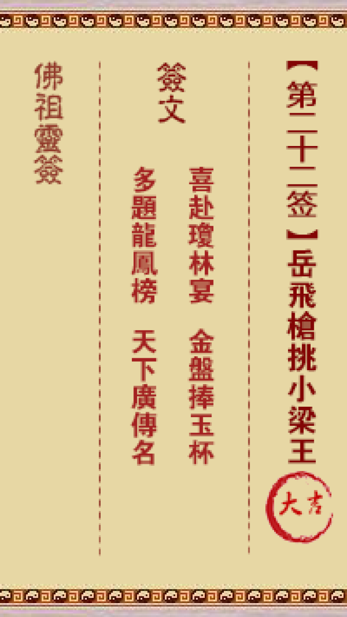佛祖灵签第二十二签: 岳飞枪挑小梁王 大吉签佛祖灵签: 签诗喜赴琼林宴,金盘 ...