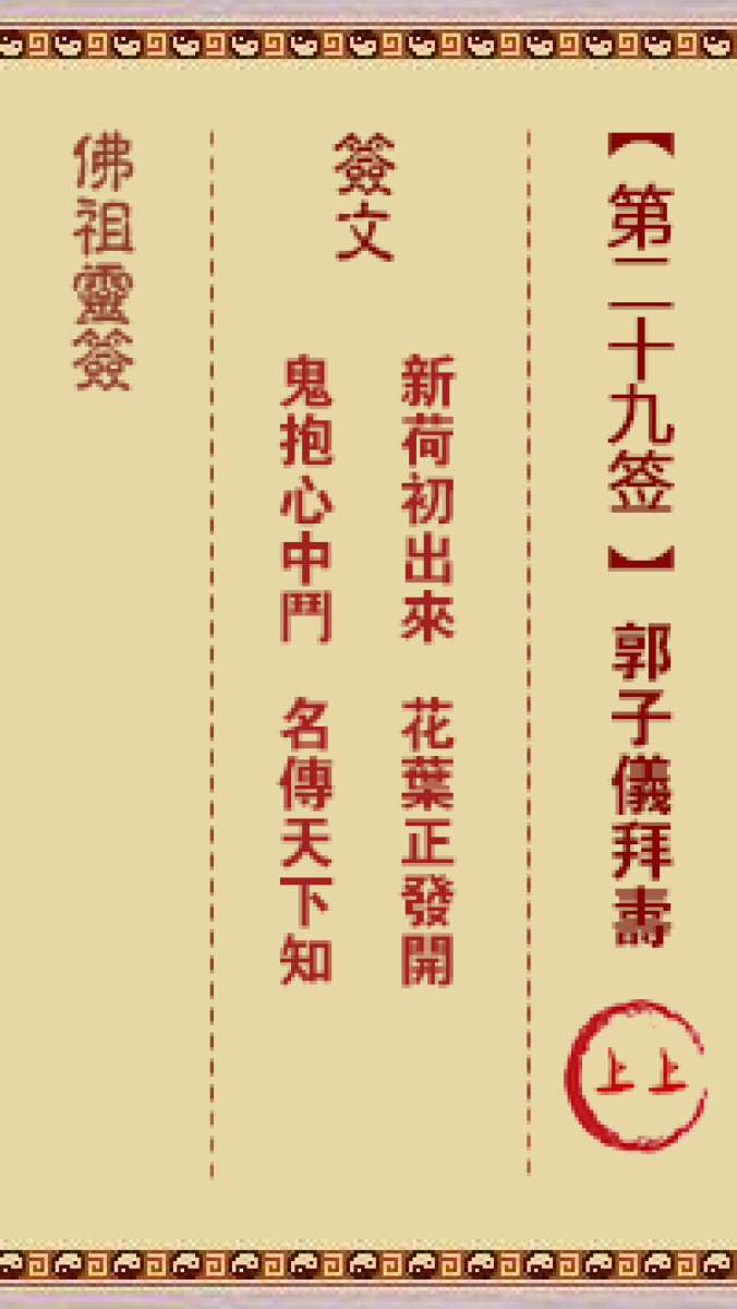 佛祖灵签第二十九签: 郭子仪拜寿 上上签佛祖灵签: 签诗新荷初出来,花叶正发 ...