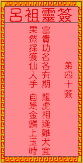 吕祖灵签第三十八签解签诗曰 范丹灰里卜行藏,相对牛衣泣未央;秋图黄花看冕节,太公八十遇文王。故求得此签者,现时正处于交接运势的关头,一旦跃过龙门三尺浪,就会超凡脱俗,有大的作为,正是否极而泰来,每事大吉。