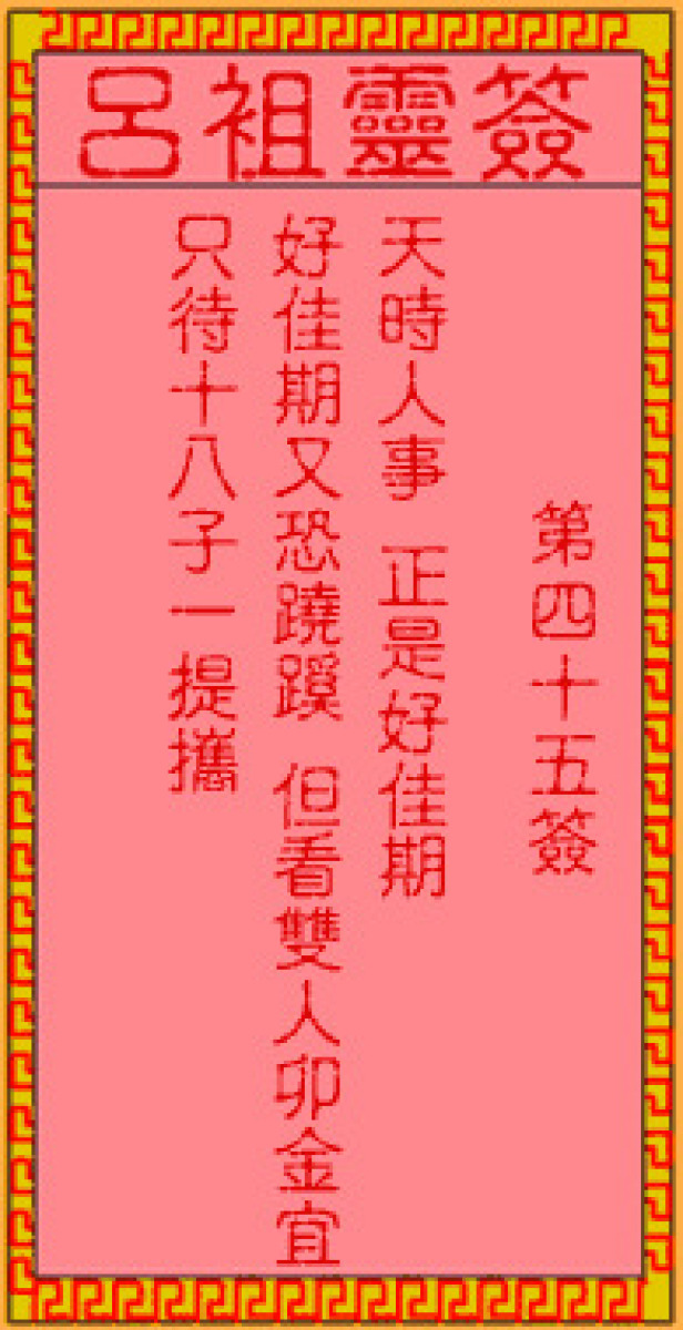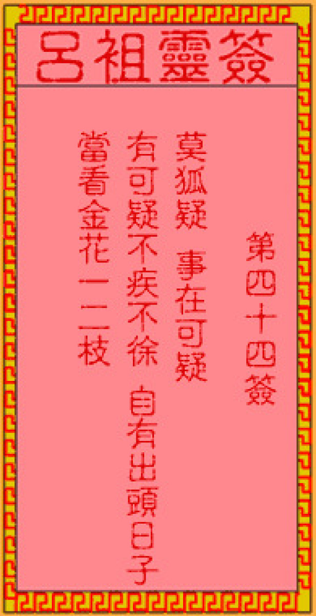 吕祖灵签第四十四签解签诗曰 下蓍佔先机,迂迴路转迷;目前只宜守,且免是和 ...