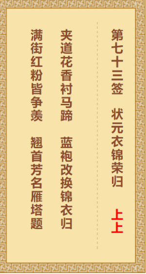 黄大仙灵签第七十三签,状元衣锦荣归,黄大仙灵签第73签解签