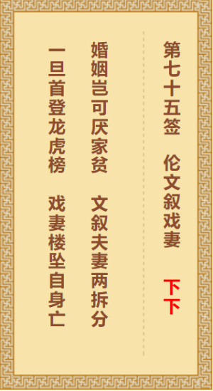 黄大仙灵签第七十五签,伦文叙戏妻,黄大仙灵签第75签解签