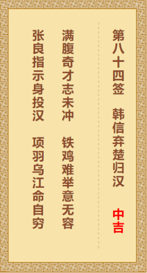 黄大仙灵签第八十四签,韩信弃楚归汉,黄大仙灵签第84签解签