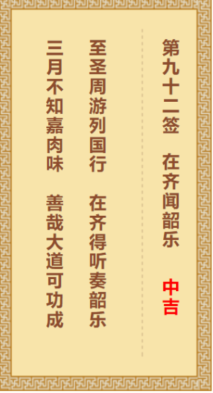 黄大仙灵签第九十二签,在齐闻韶乐,黄大仙灵签第92签解签