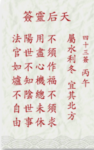 妈祖灵签第四十三签,属水利冬宜其北方,妈祖灵签第43签解签