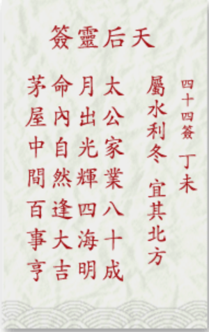 妈祖灵签第四十四签,属水利冬宜其北方,妈祖灵签第44签解签