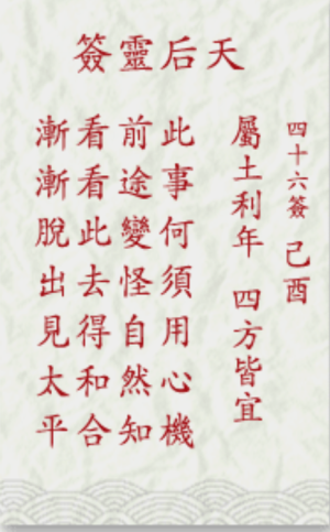 妈祖灵签第四十六签,属土利年四方皆宜,妈祖灵签第46签解签