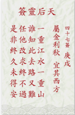 妈祖灵签第四十七签,属金利秋宜其西方,妈祖灵签第47签解签