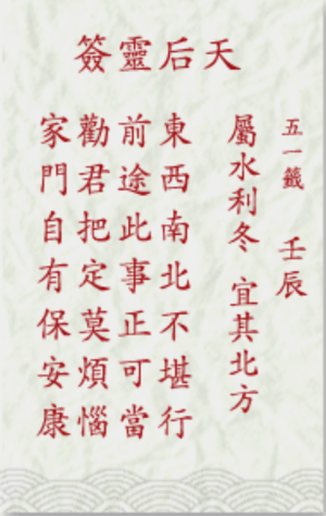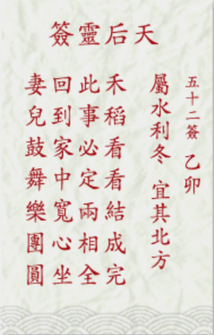 妈祖灵签第五十二签,属水利冬宜其北方,妈祖灵签第52签解签