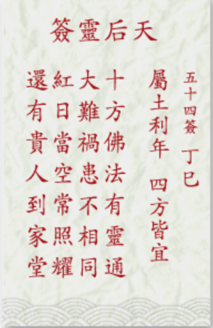 妈祖灵签第五十四签,属土利年四方皆宜,妈祖灵签第54签解签