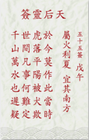 妈祖灵签第五十五签,属火利夏宜其南方,妈祖灵签第55签解签