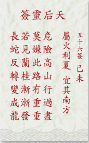 妈祖灵签第五十六签,属火利夏 宜其南方,妈祖灵签第56签解签