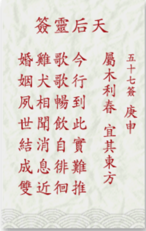 妈祖灵签第五十七签,属木利春 宜其东方妈祖灵签第57签解签