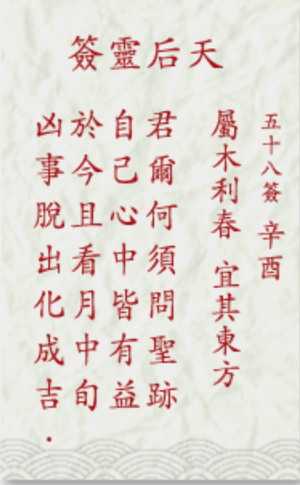 妈祖灵签第五十八签,属木利春宜其东,妈祖灵签第58签解签