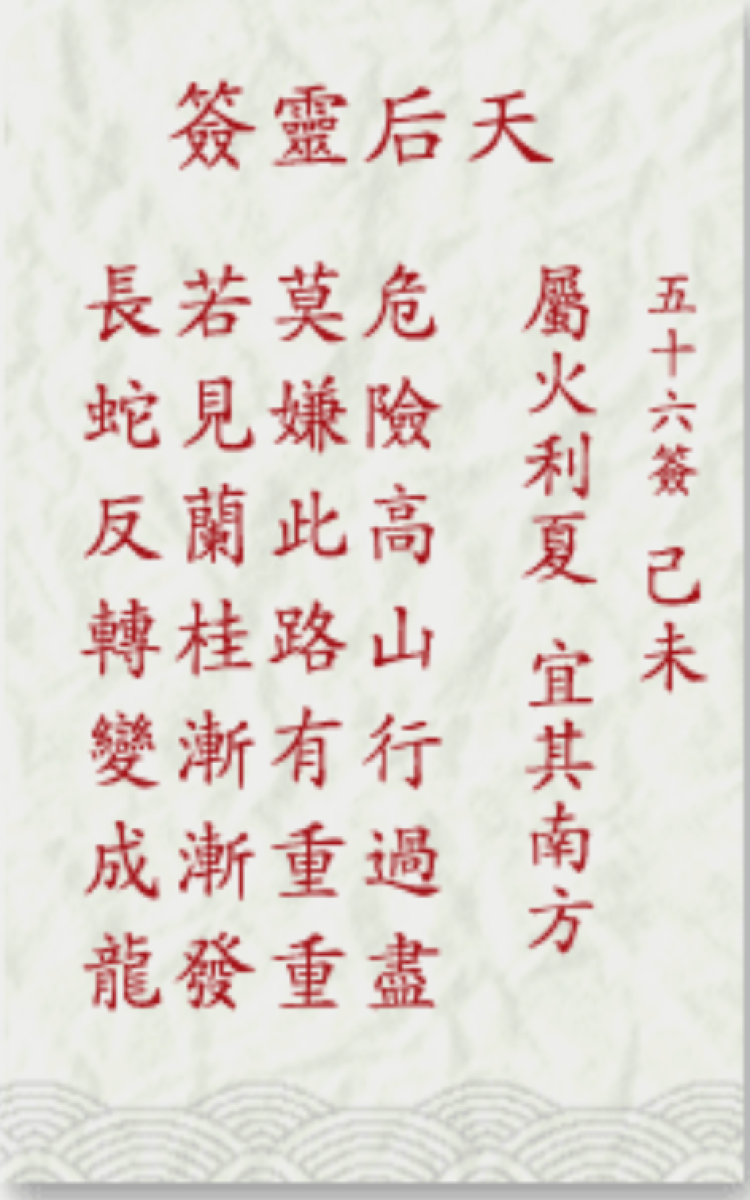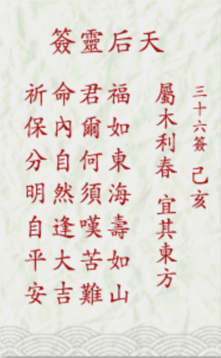 妈祖灵签第三十六签: 己亥 签题:己戌 签文福如东海寿如山 君尔何须叹苦难 ...