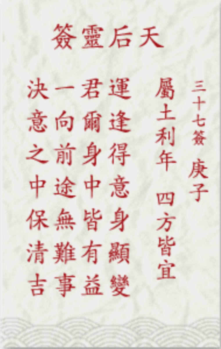 妈祖灵签第三十七签: 庚丑 签题: 庚子 签文运逢得意身显变 君尔身中皆有益 ...
