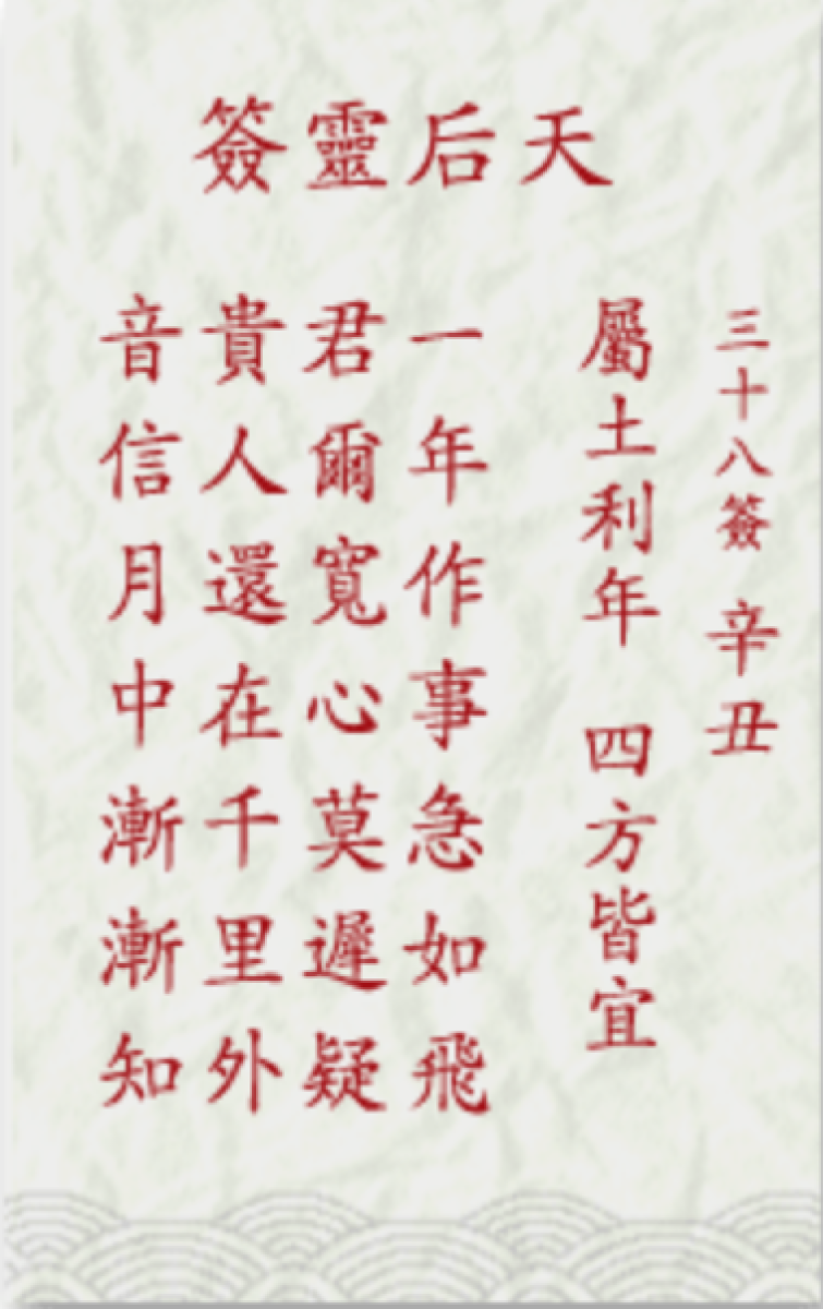 妈祖灵签第三十八签: 庚卯 签题:辛丑 签文名显有意在中央 不须祈祷心自安 ...