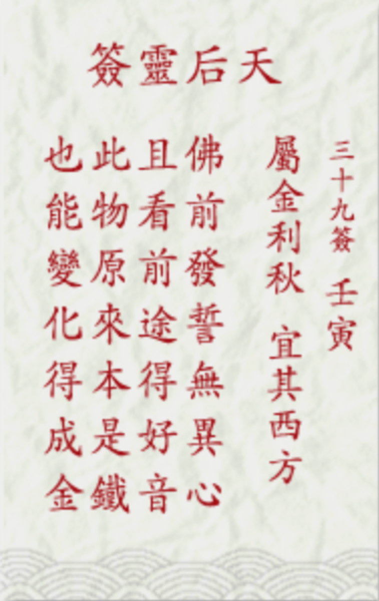 妈祖灵签第三十九签: 壬寅 签题:庚巳 签文意中若问神仙路 劝尔且退望高楼 ...