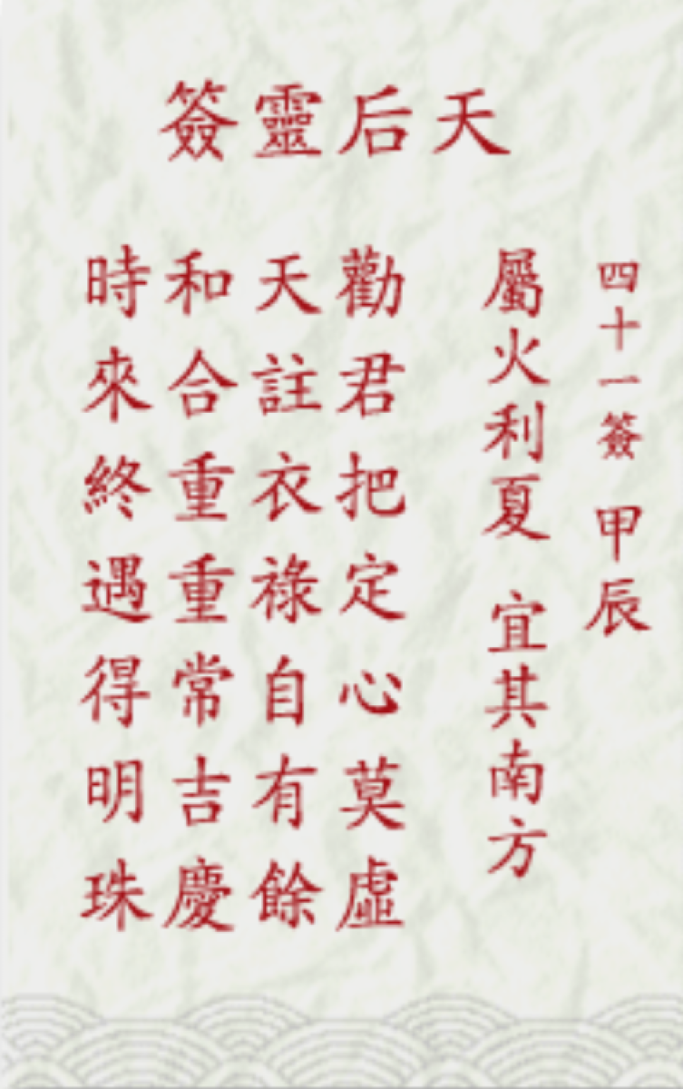 妈祖灵签第四十一签: 甲辰 签题:甲辰 今行到此实难推 歌歌畅饮自徘徊 鸡犬 ...