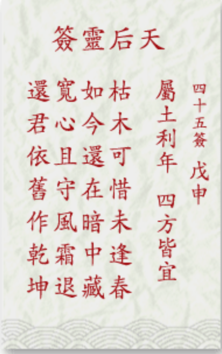 妈祖灵签第四十五签: 戊申 签题:辛申 签文花开今已结成果 富贵荣华终到老 ...