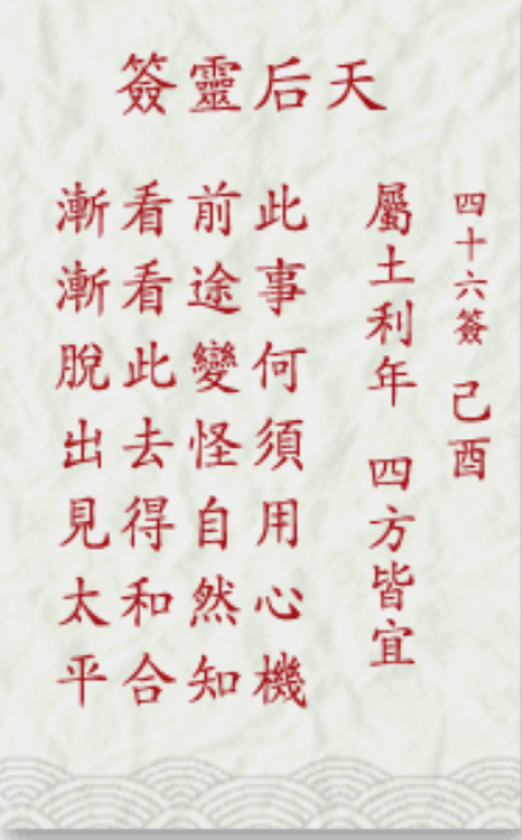 妈祖灵签第四十六签: 辛戌 签题:己酉 签文功名得意与君显 前途富贵喜安然 ...