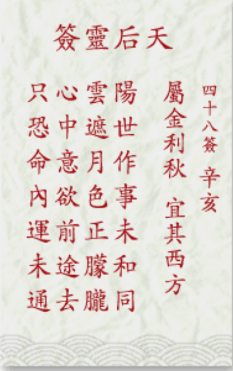 妈祖灵签第四十八签: 辛卯 签题:辛亥 签文阳世作事未和同 云遮月色正朦胧 ...