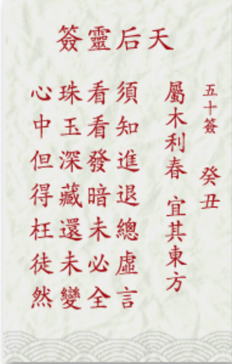 妈祖灵签第五十签: 壬未 签题:癸丑 签文佛前发誓无异心 且看前途得好音 此 ...