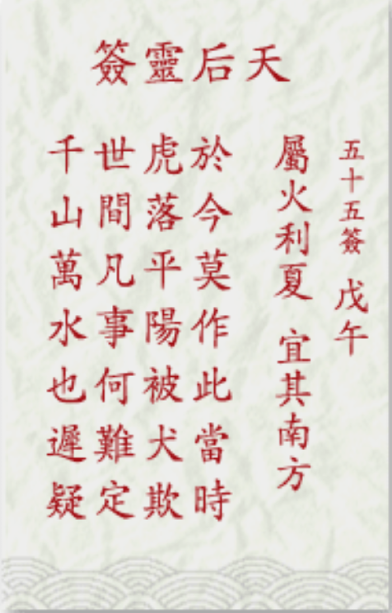 妈祖灵签第五十五签: 戊午 签题:癸申 签文须知进退总言虚 看看发暗未必全 ...