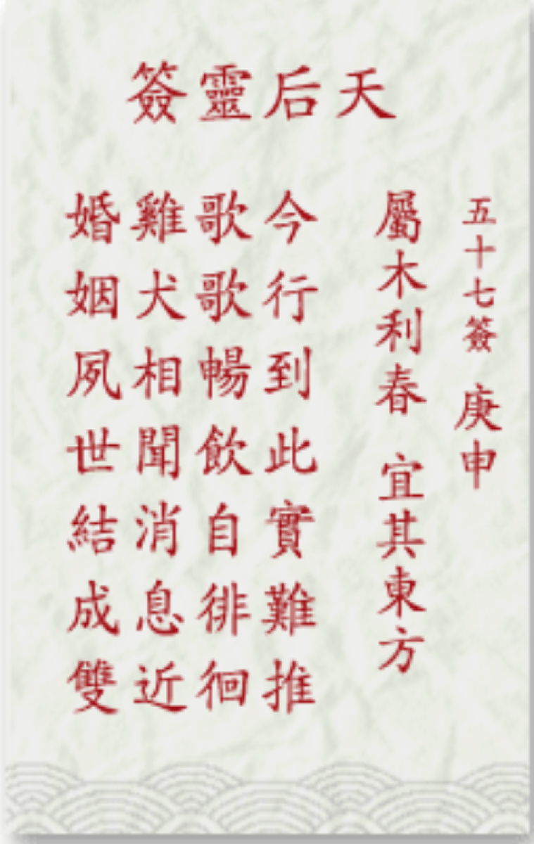 妈祖灵签第五十七签: 庚申 签题:癸丑 签文劝君把定心莫虚 前途清吉得运时 ...