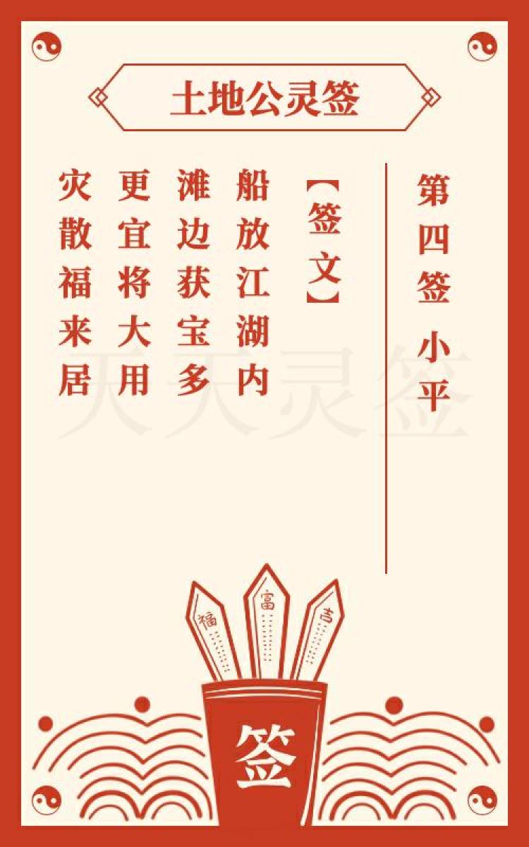 土地公灵签第四签解签土地公灵签第4签 小平签签诗船放江湖内,滩边获宝多, ...
