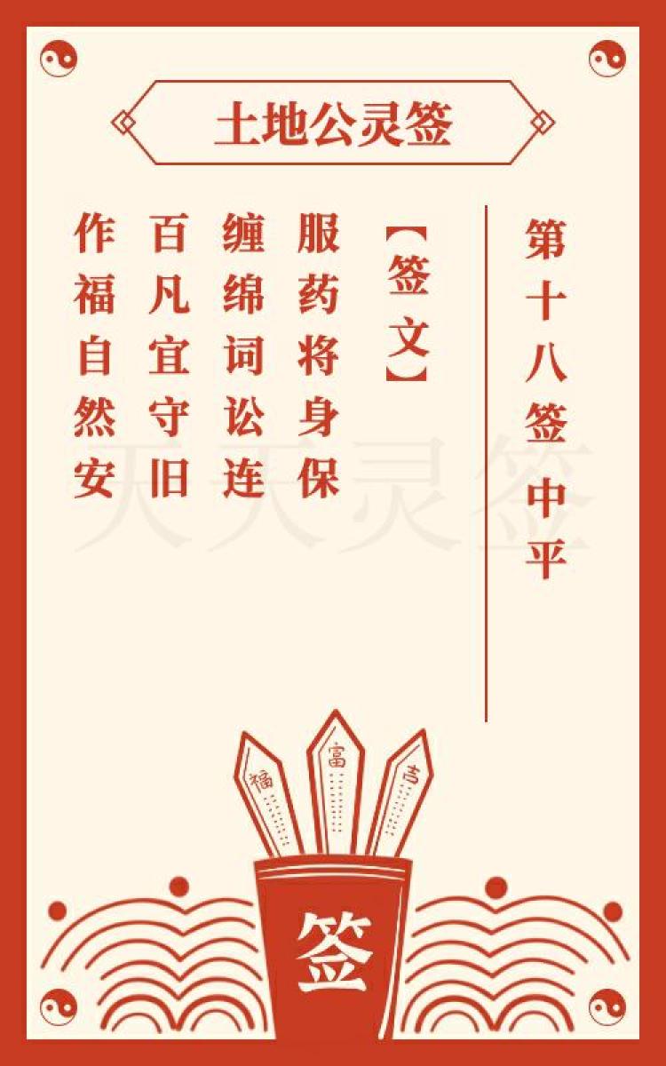 土地公灵签第十八签解签土地公灵签第18签 中平签签诗服药将身保,缠绵词讼连 ...