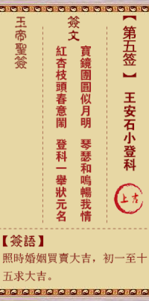 玉帝灵签第五签,王安石小登科,玉帝灵签第5签解签