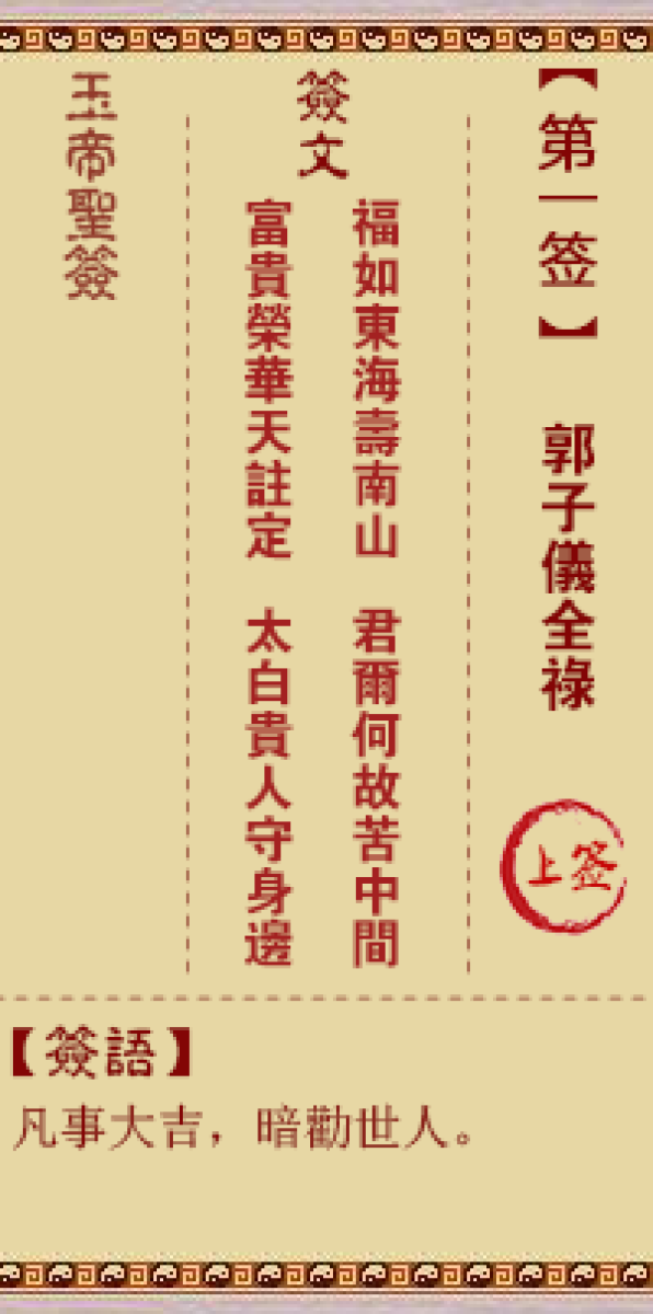 玉帝灵签第一签解签甲甲三圣杯郭子仪全禄上签诗文福如东海寿南山,君尔何故 ...