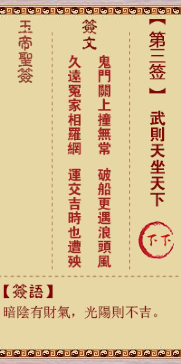 玉帝灵签第三签解签甲丙三阴杯武则天坐天下下诗文鬼门关上撞无常,破船更遇 ...