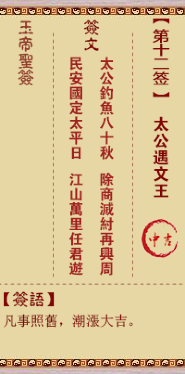 玉帝灵签第十二签解签乙乙笑圣圣太公遇文王中吉诗文太公钓鱼八十秋,除商灭 ...