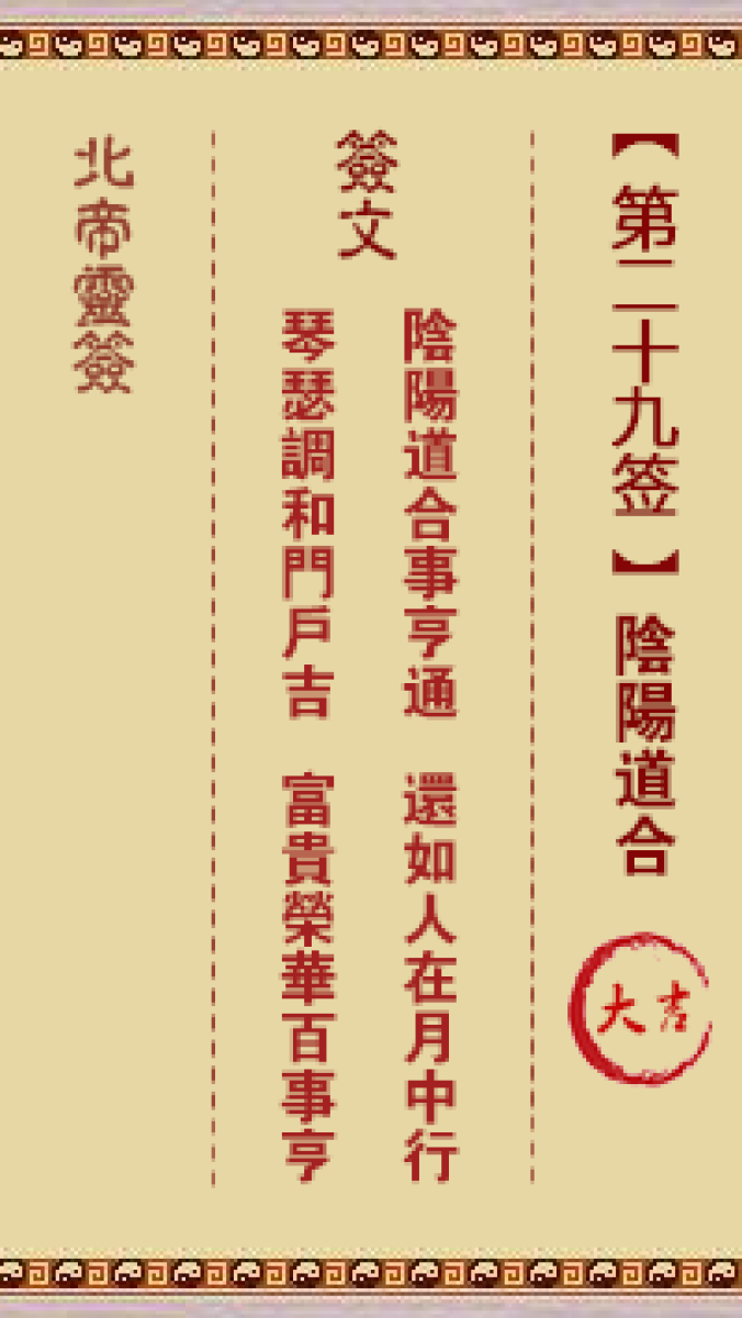 北帝灵签第二十九签解签北帝灵签第二十九签:阴阳道合 大吉签文阴阳道合事亨 ...