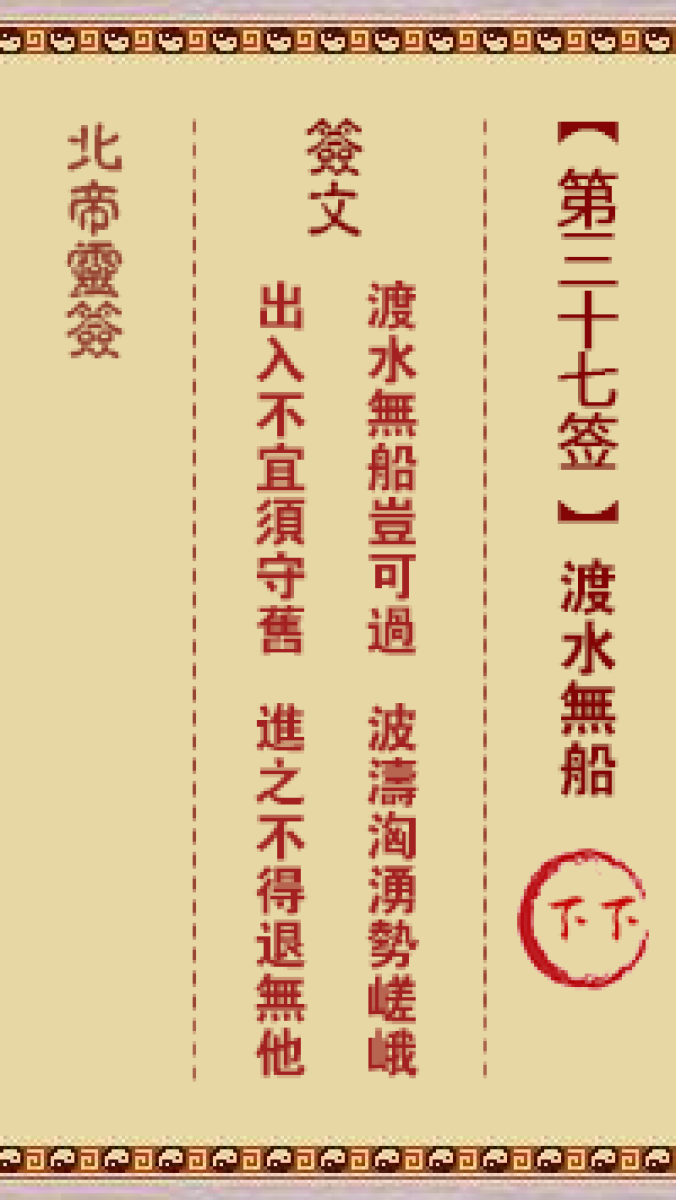 北帝灵签第三十七签解签北帝灵签第三十七签:渡水无船 下下签文渡水无船岂可 ...
