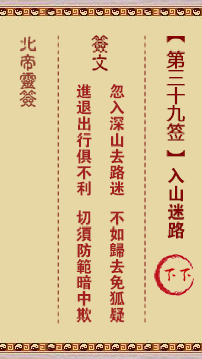 北帝灵签第三十九签解签北帝灵签第三十九签:入山迷路 下下签文忽入深山去路 ...