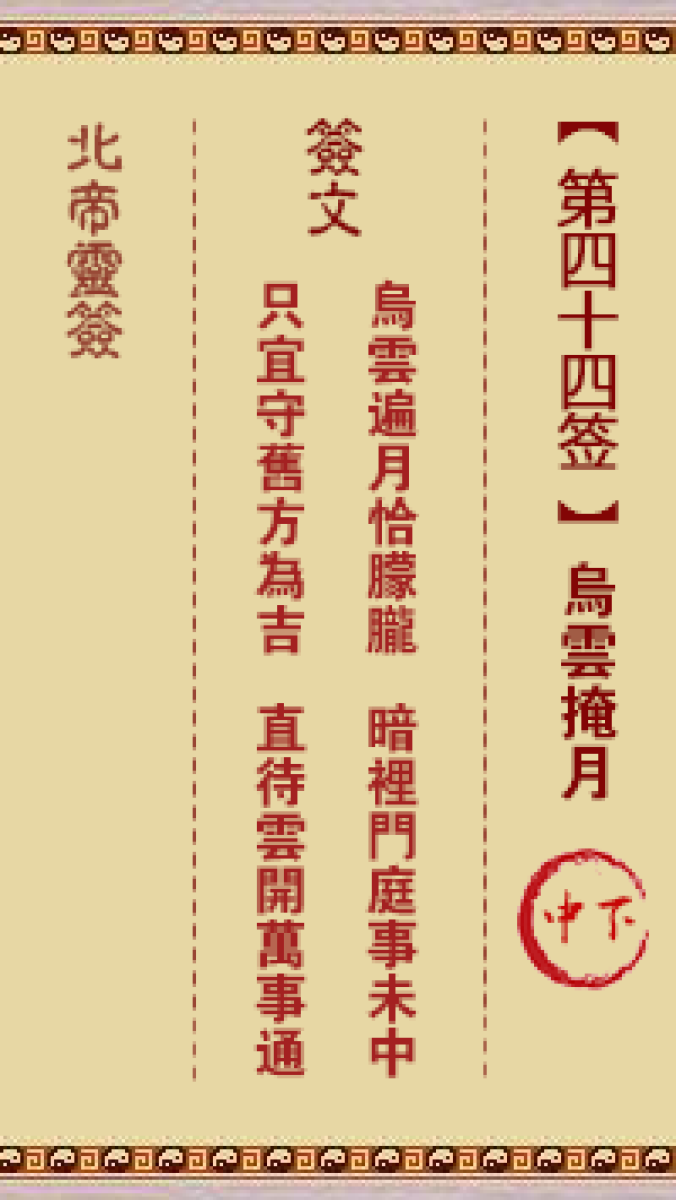 北帝灵签第四十四签解签北帝灵签第四十四签:乌云掩月 中下签文乌云遍月恰朦 ...