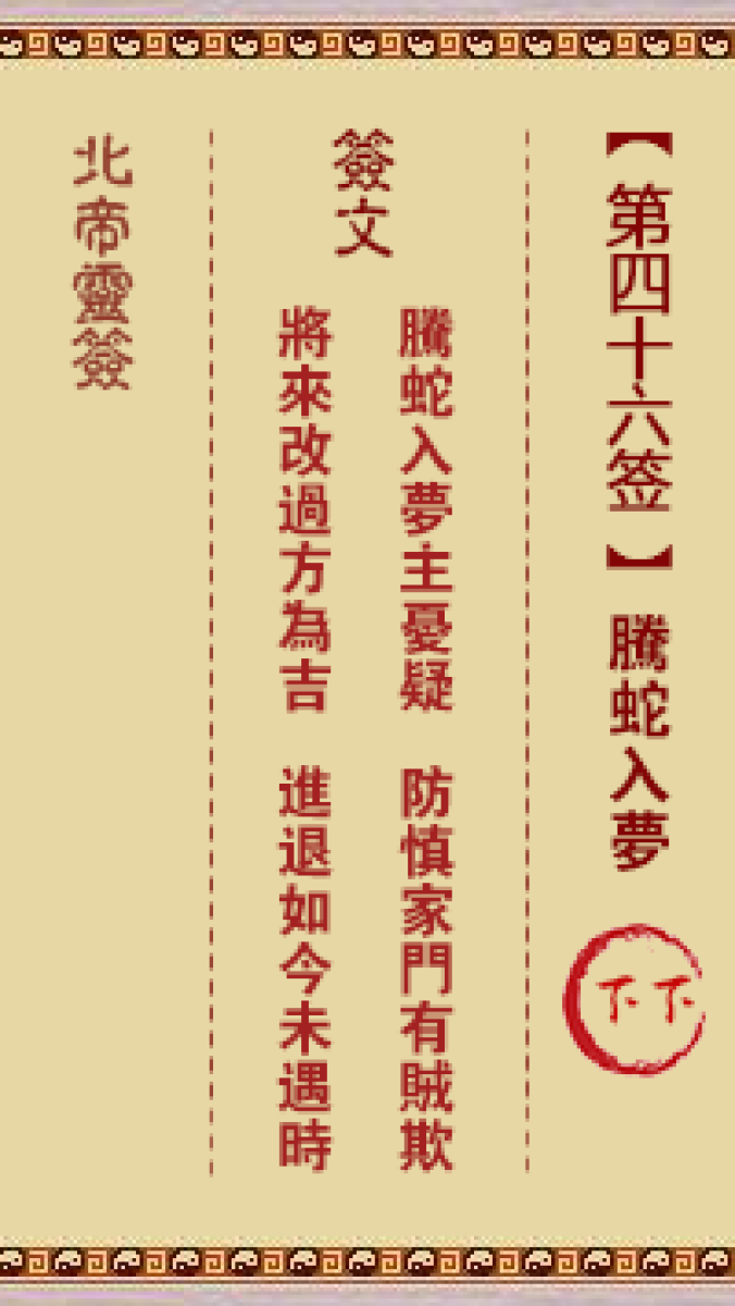 北帝灵签第四十六签解签北帝灵签第四十六签:腾蛇入梦 下下签文腾蛇入梦主忧 ...