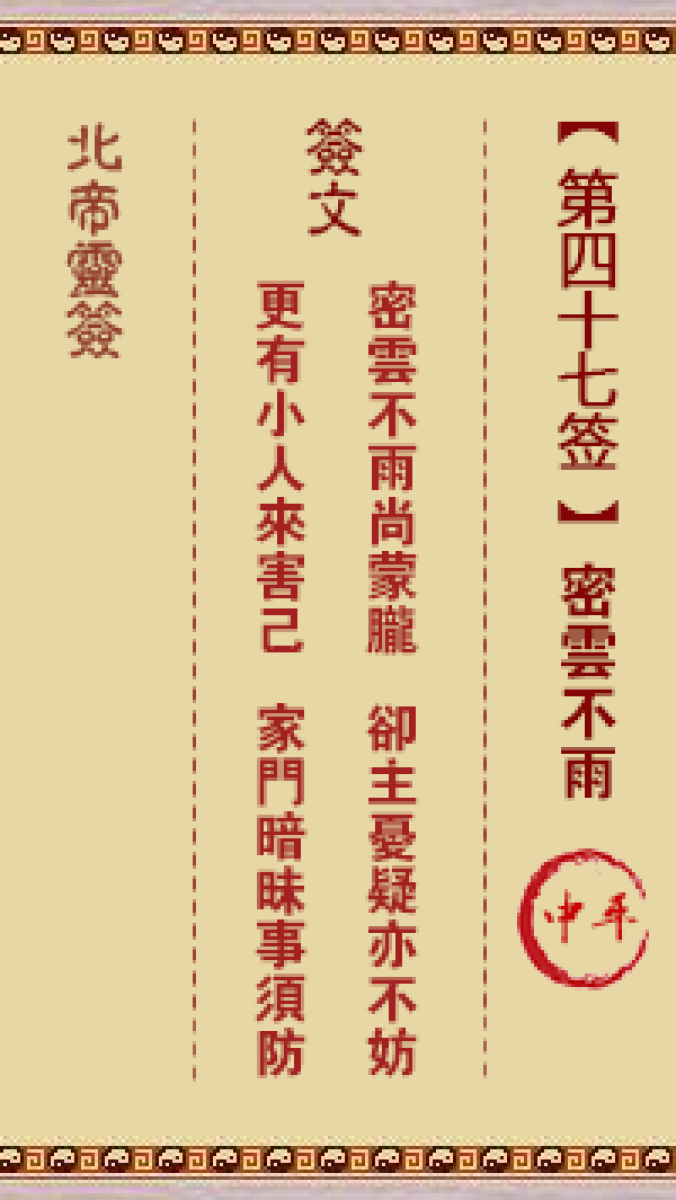 北帝灵签第四十七签解签北帝灵签第四十七签:密云不雨 中平签文密云不雨尚蒙 ...