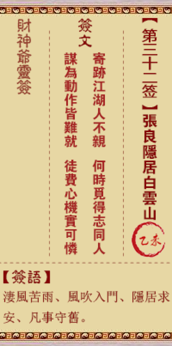 财神灵签第三十二签解签三二签、乙未签、张良隐居白云山太阳未照雨纷纷、淅 ...