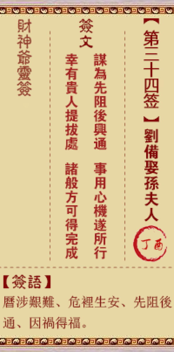 财神灵签第三十四签解签三四签、丁酉签、刘备娶孙夫人东吴西蜀结婚姻、配合 ...