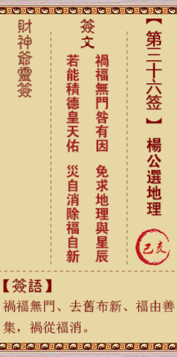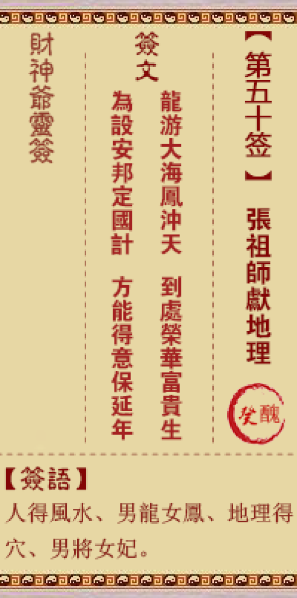 财神灵签第五十签解签五十签、癸丑签、张祖师献地理山山包里水水归、真穴天 ...