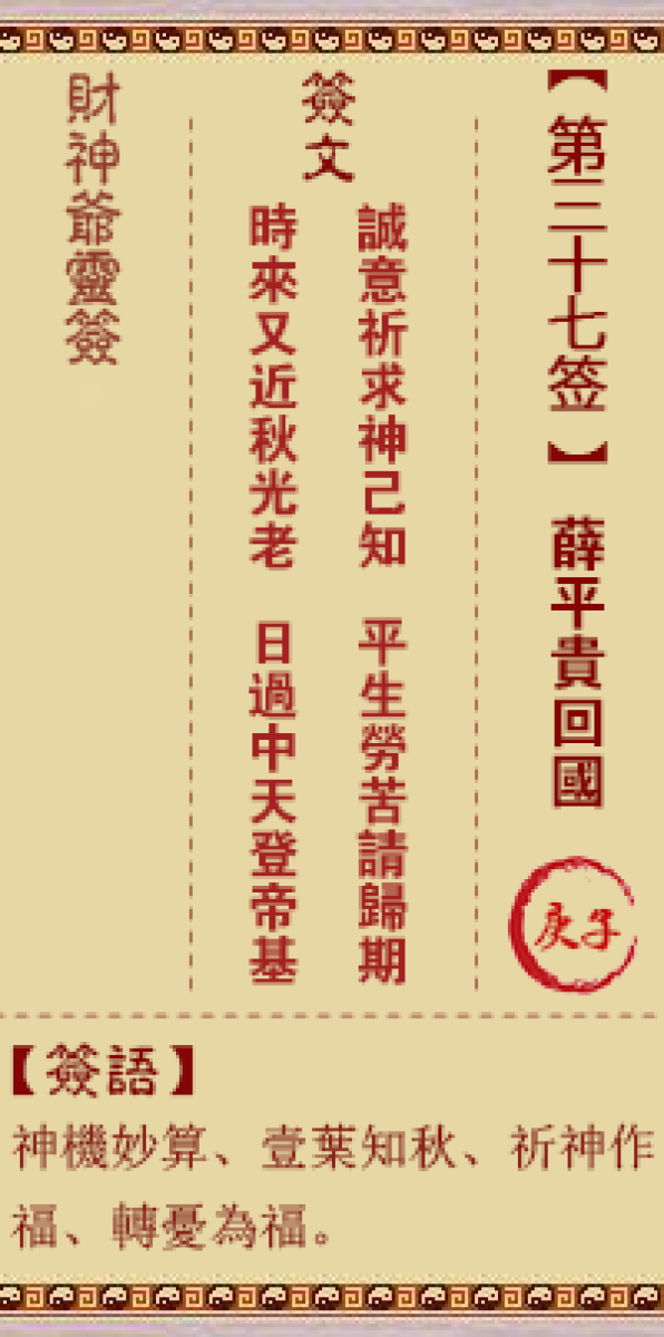财神灵签第三十七签解签三七签、庚子签、薛平贵回国问圣求神断无差、知君有 ...